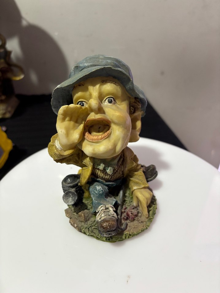 Şapkalı, elini ağzına götürmüş ve dokulu bir taban üzerinde oturan haki ve gri renkte figürin.