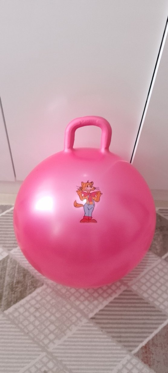 Saplı, canlı pembe renkte, üzerinde çizgi film karakteri baskısı bulunan zıplayan top. Aktif oyun ve denge egzersizleri için uygundur.