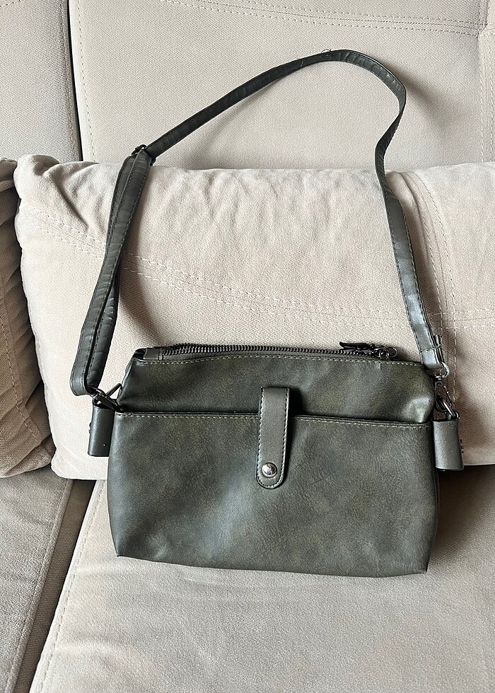 4 ayrı gözü var. suni deri haki rengi uzun saplı çanta