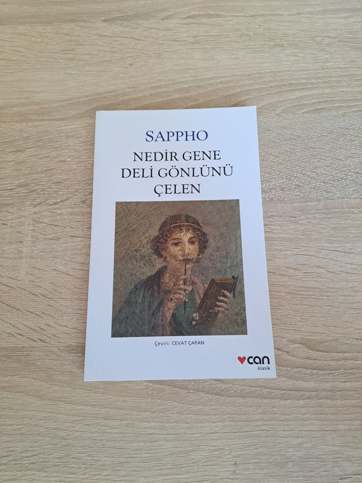 Cevat Çapan çevirisiyle Sappho'nun 'Nedir Gene Deli Gönlünü Çelen' adlı şiir kitabı, kapakta klasik bir eser görseli bulunuyor.