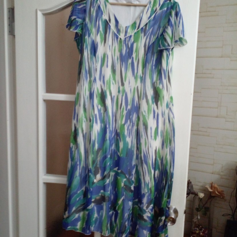 ürün cok iyi durumda fazla giyilmedi yepyenidir mavi yeşil desenli şifon elbise v yala düşuk kol icı beyaz astarlı yandan fermuarli boy 107 omuz 5 kol.16 kolarası 53 basen 54 alana hayırlı olsun urünlerim sepetten satılmıycak iptal edilir ilginize