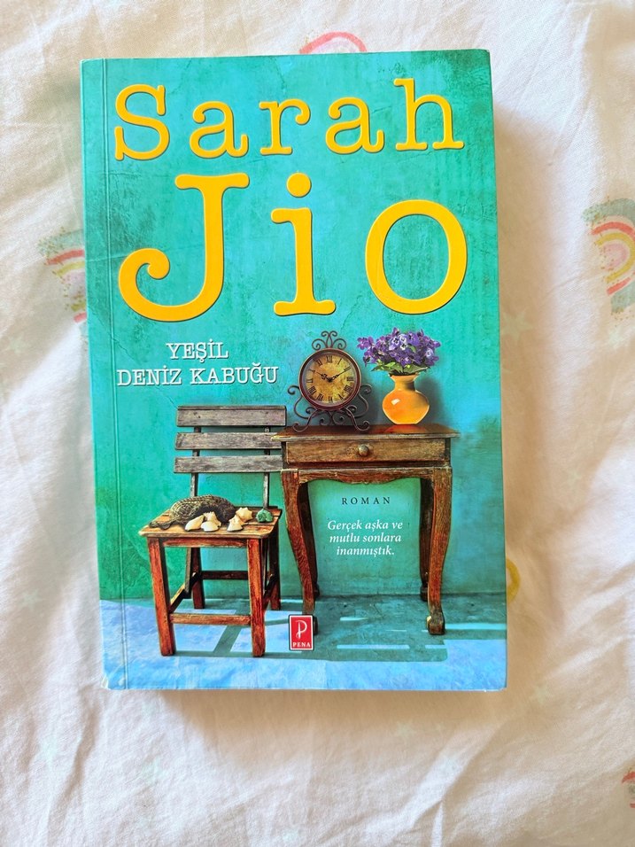 Sarah Jio'nun "Yeşil Deniz Kabuğu" romanı, turkuaz zemin üzerinde ahşap sandalye, masa, saat ve çiçek vazosu içeren vintage tarzda kapak tasarımına sahip.