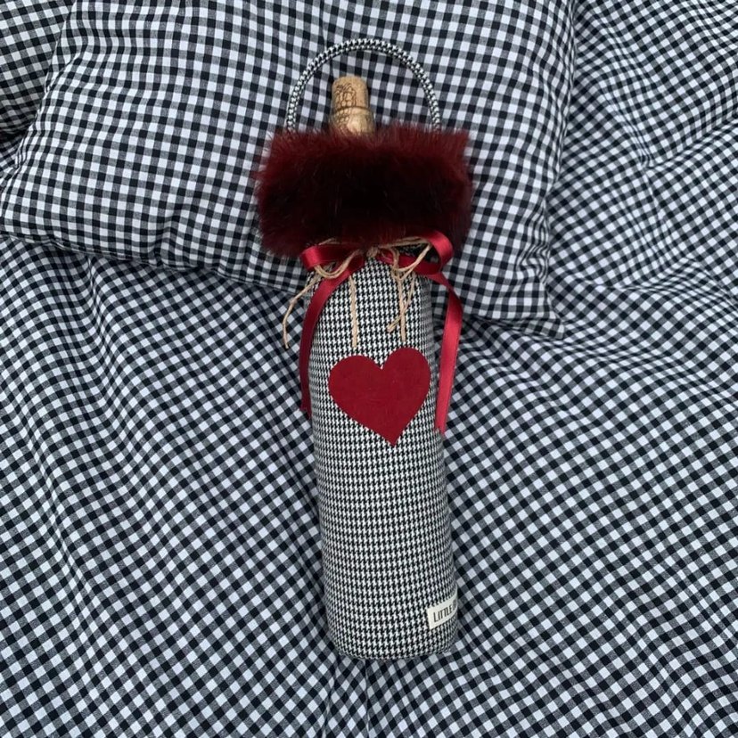 Ekose desenli, kalp detaylı ve kurdele süslemeli yumuşak dokulu hediyelik şarap taşıma çantası. Ürünlerimiz el yapımı özel dikimdir.