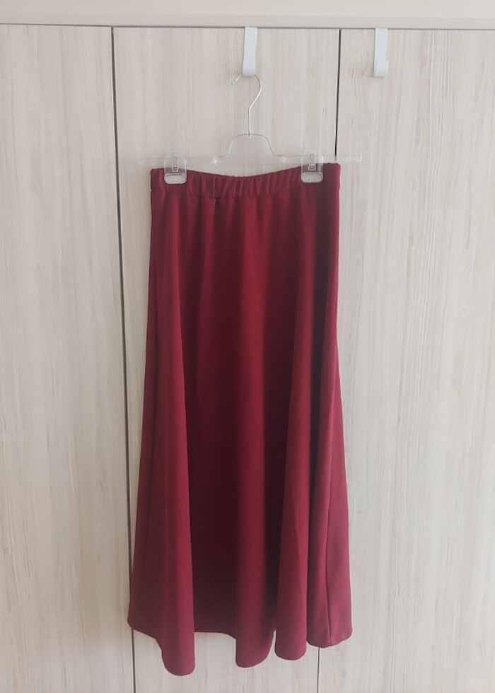 Bordo/ şarap rengi tok bir renk, güzel etek. 3 yazıyor beden olarak, M-L'ye uygun. Midi etek diger marka temsili