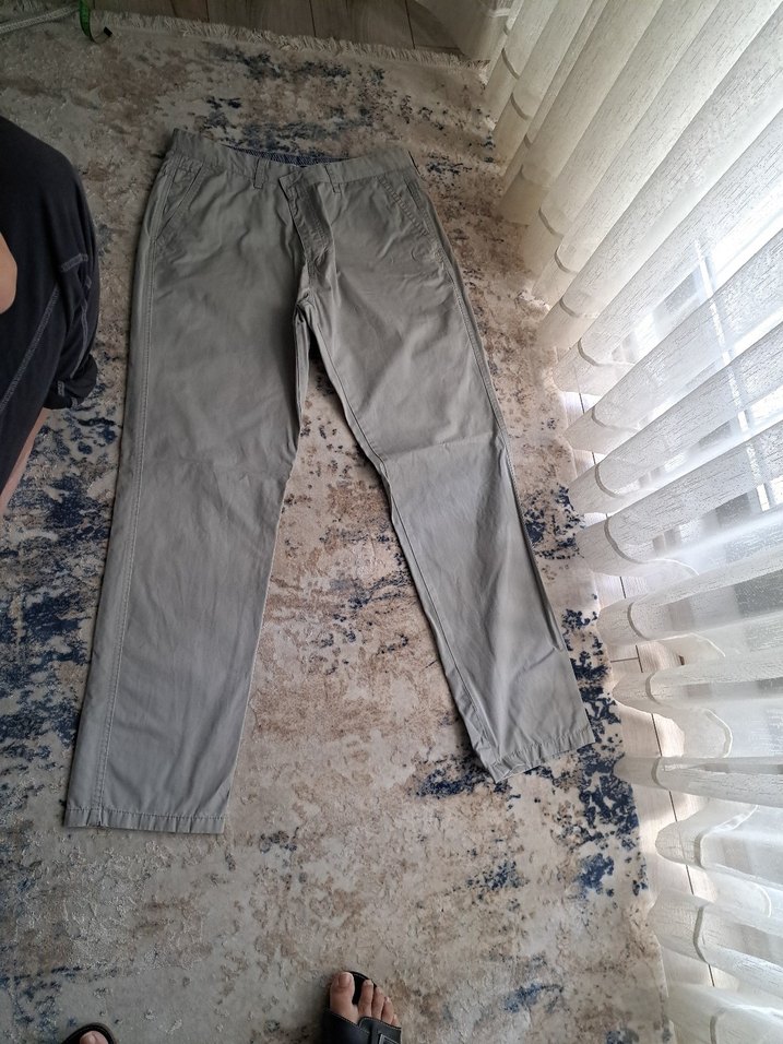Bej renkte, keten kumaştan, bol kesim ve kemerli erkek pantolonu. Normal boyda, sade tasarımlı, rahat ve şık günlük kullanım için uygun.
