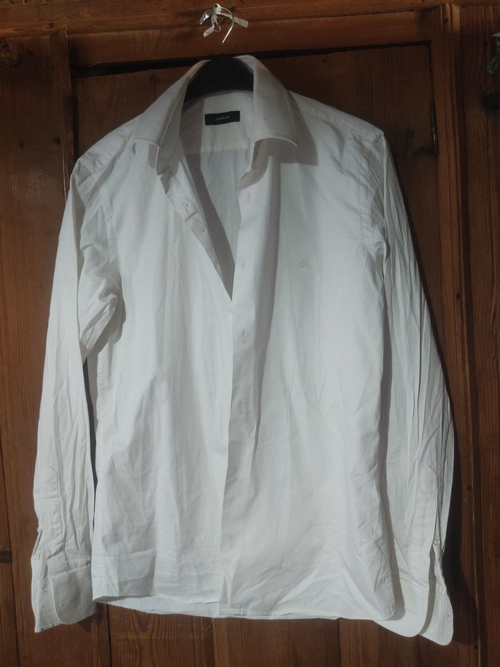 Düğmeli, uzun kollu beyaz erkek gömleği.Normal boy ve regular fit, ofis ile günlük kullanıma uygun. sarı lekeler oluşmuş kuru temizlemeye ihtiyaci var