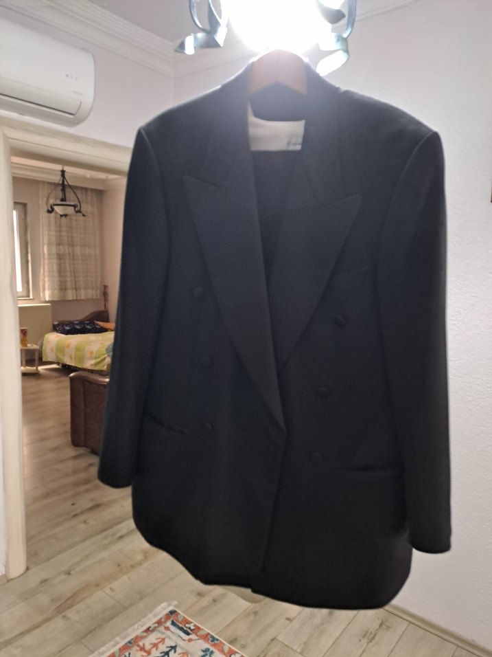 Düğmeli ön cepheye sahip siyah erkek takım elbise, klasik kesim, uzun kollu ve ofis için uygun şık bir modeldir. ️
