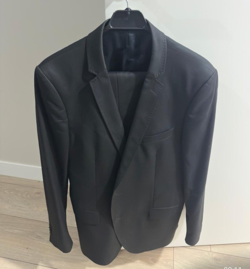 Düğmeli, yakalı ve uzun kollu siyah erkek takım elbise Regular fit, ipeksi dokulu ve midi boyda, iş ortamı için uygundur.