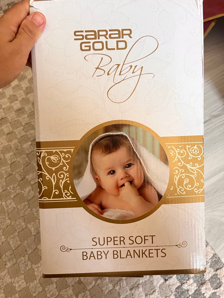 Sarar Gold bebek battaniyesi parlak altın renginde, ipeksi ve baskılı desene sahiptir. Süper yumuşak ve bebekler için naziktir. Hiç kullanılmadı yıkandı sadece