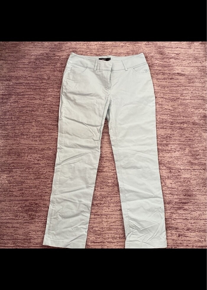 Hiç giyilmedi.Bedeni uymadığı için bana satıyorum.Sıfırdır,tertemizdir.Defosu falan yoktur.Rengi açık mavidir.Kırışık olduğu için öyle duruyor.Çok şık bir pantolondur.Fotoğraflardan inceleyebilirsiniz .