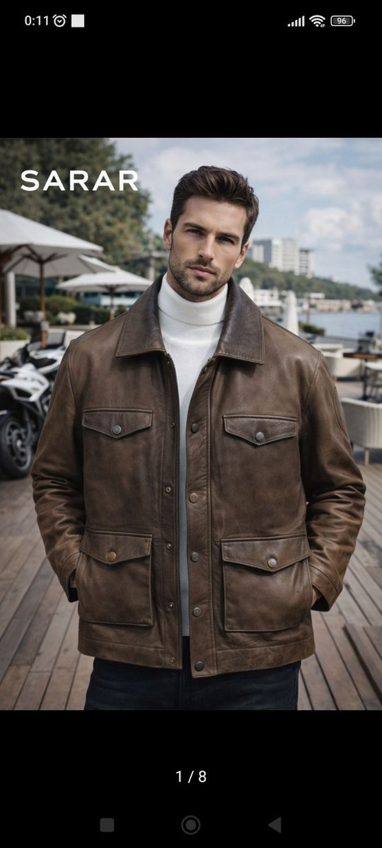SARAR kahverengi deri erkek ceket, düğmeli ve kesik yaka detaylıdır. Uzun kollu, normal uzunlukta ve rahat kesimlidir, günlük kullanıma uygundur.