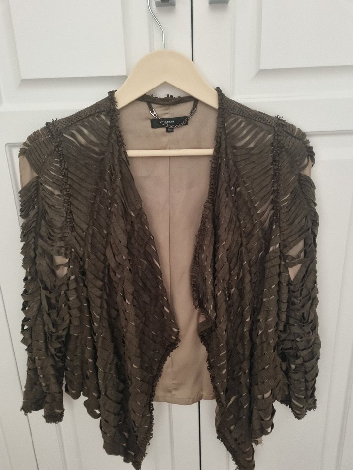 Drapeli haki renk süet salaş ceket yakası kesik ve uzun kollu, yumuşak rahat ceket