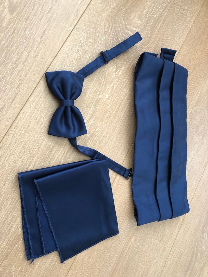 Koyu mavi erkek papyon seti, papyon, kuşak ve cep mendilinden oluşur. Düz ve şık dokusu ile klasik sokak stili için uygundur.