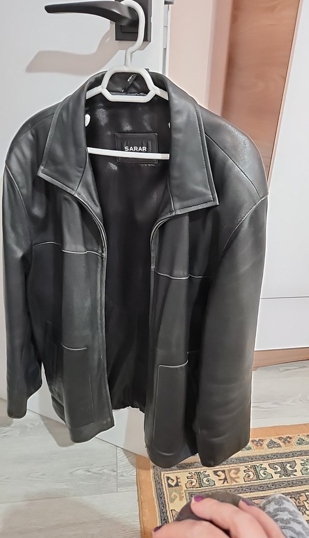 Sarar marka siyah deri, fermuarlı erkek ceket. Normal boy, regular fit ve notched lapel yakaya sahip, günlük sokak stili için uygun. Renkte hafif solmalar mevcuttur. Fotoğtaflarda zaten görünüyor.
