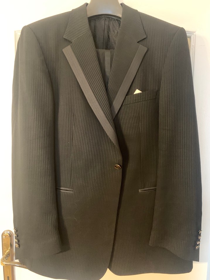 Siyah renkte, klasik kesim Sarar Smokin takım. Bir kere giyildi yeni sayılır. Saten şerit detaylı çok şık bir takım. Ceket beden 54 eu/ 44R usa; pantalon 54 eu/ 38[44] usa.