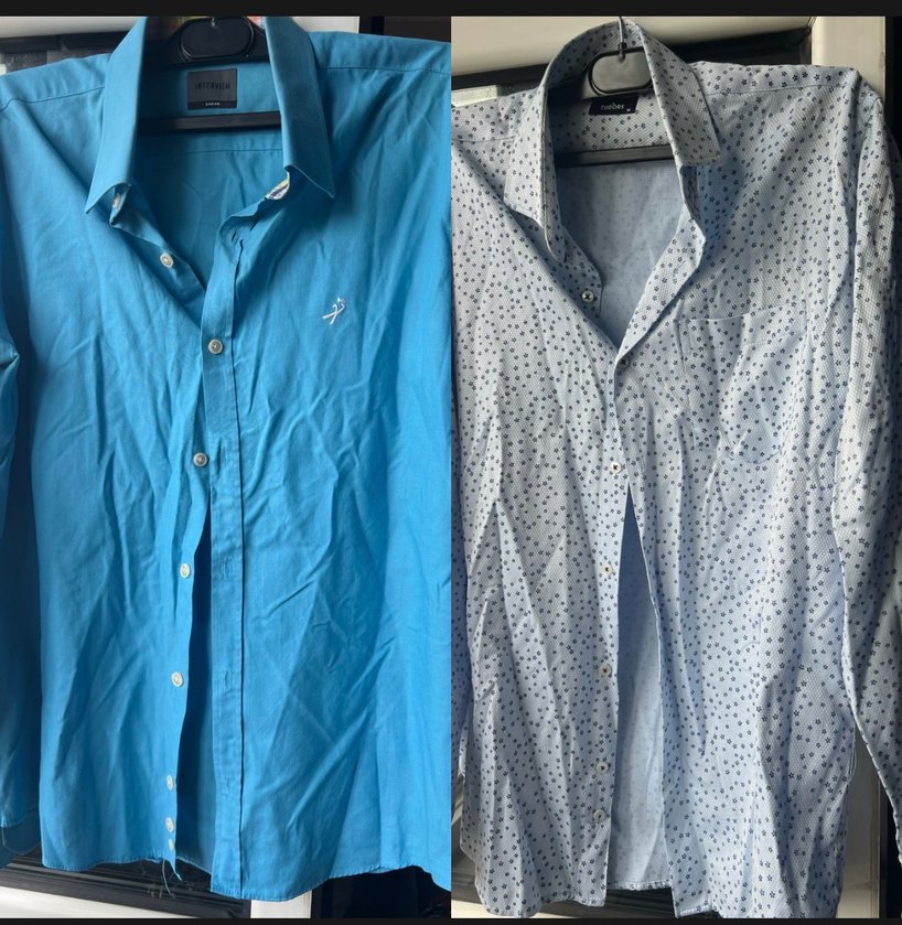 Erkekler için düğmeli, uzun kollu, yakalı pamuk gömlek. Mavi olan SARAR,desenli olan TUDORS marka.Rahat kesimi ve günlük sokak tarzına uygunluğu ile dikkat çeker.Kol altında kullanımdan dolayı hafif sararma var ama dışardan çok belli olmuyor.İkisinin birlikte fiyatıdır.