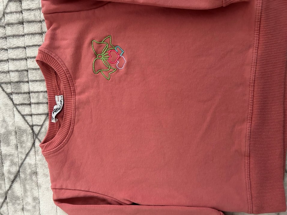 Şardonludur nakışlı, bisiklet yaka ve uzun kollu kız sweatshirtü. Pastel pembe renkte, yumuşak dokulu ve sade normcore tarzda.