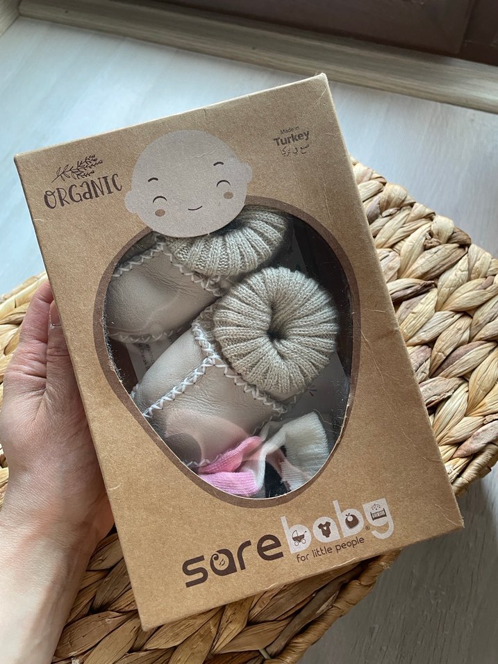 Paketi dahi fotoğraf için açtım hiç denenmedi yanlışlıkla iki tane almışım. Sarebaby organik bebek patik seti, pastel bej tonlarda, rahat ve bol kesim, yumuşak doğal kumaştan üretilmiştir.
