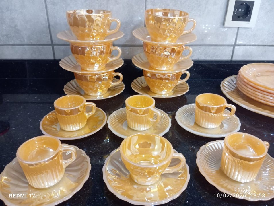 Parlak ve dokulu tasarıma sahip, 12 parça açık sarı fincan ve tabak seti. Çay veya kahve sunumu için uygundur. ☕