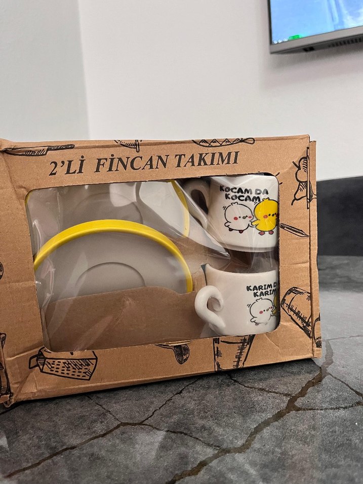 İki sarı fincan ve tabaktan oluşan set, her fincanda sevimli çizgi karakterler ve Türkçe yazılar bulunur. ☕