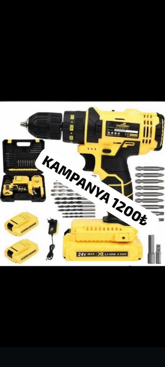 Diger markasının sarı renkli 24V Maks Li-ion matkap seti, piller, şarj cihazı ve çeşitli matkap uçları içerir.