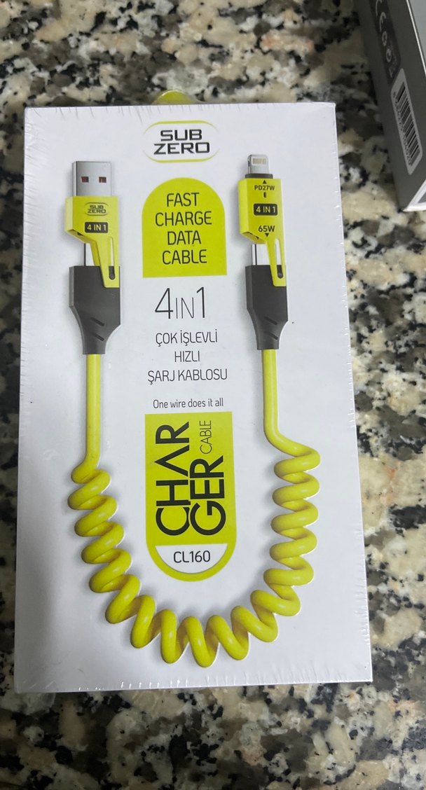 Sarı renkli, çok işlevli 4'ü 1 arada hızlı şarj ve veri kablosu. Esnek spiral tasarımı ile farklı cihazlara uyumludur. ⚡