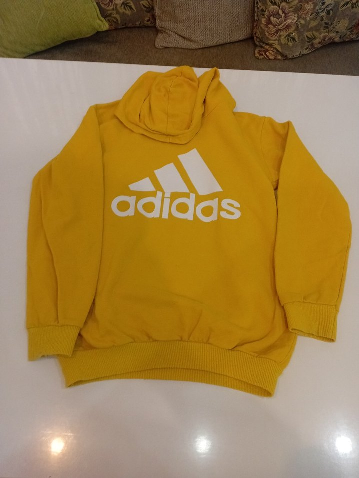 Sarı Adidas kapüşonlu sweatshirt, rahat kesim ve uzun kollu. Yumuşak ve sıcak kumaştan üretilmiş, renkli baskılı logo ile sportif tarz sunar. 3.resimde dakla seklinde kumaş lekesi vardır 13 yas