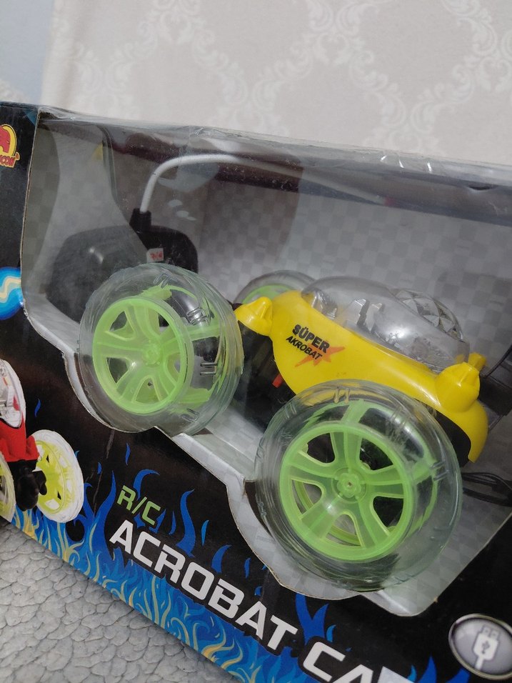 Renkli sarı oyuncak araba, büyük yeşil tekerlekler ve şeffaf kokpit içerir. "ACROBATA" yazılıdır ve akrobatik hareketler için uygundur. yeni ürün adet fiyatıdıır. sorunu yok çalışıyor. kumandası pilli, araba şarjlıdır. PİL DAHİL DEĞİLDİR. sarı ve kırmızı rengi mevcuttur. boyutunu görmek için son fotoğrafa bakabilirsiniz. kutu boy : 20 cm en: 30.5 cm dir