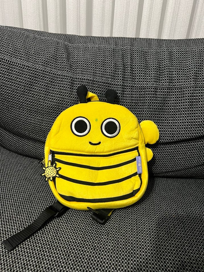 Canlı sarı renkte, arı figürlü çocuk çantası. Ayarlanabilir askılar ve önünde fermuarlı cep bulunur. Fotoğrafta göründüğü gibi çantanın önünde hafif bi kalem lekesi var yıkanınca çıkar. Terlik panduf hiç giyilmedi çok temiz