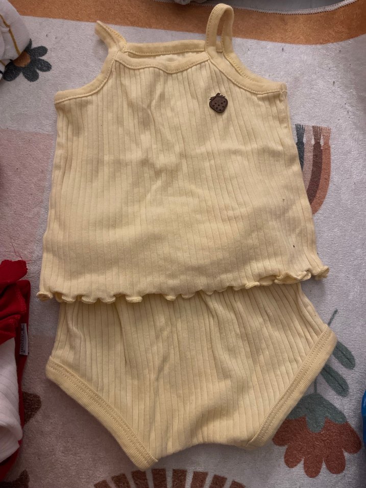 Sarı pastel renkte, askılı ve düğmeli bebek kız takımı. Fitilli dokusu ve yumuşak kumaşı ile rahat kullanım sağlar.