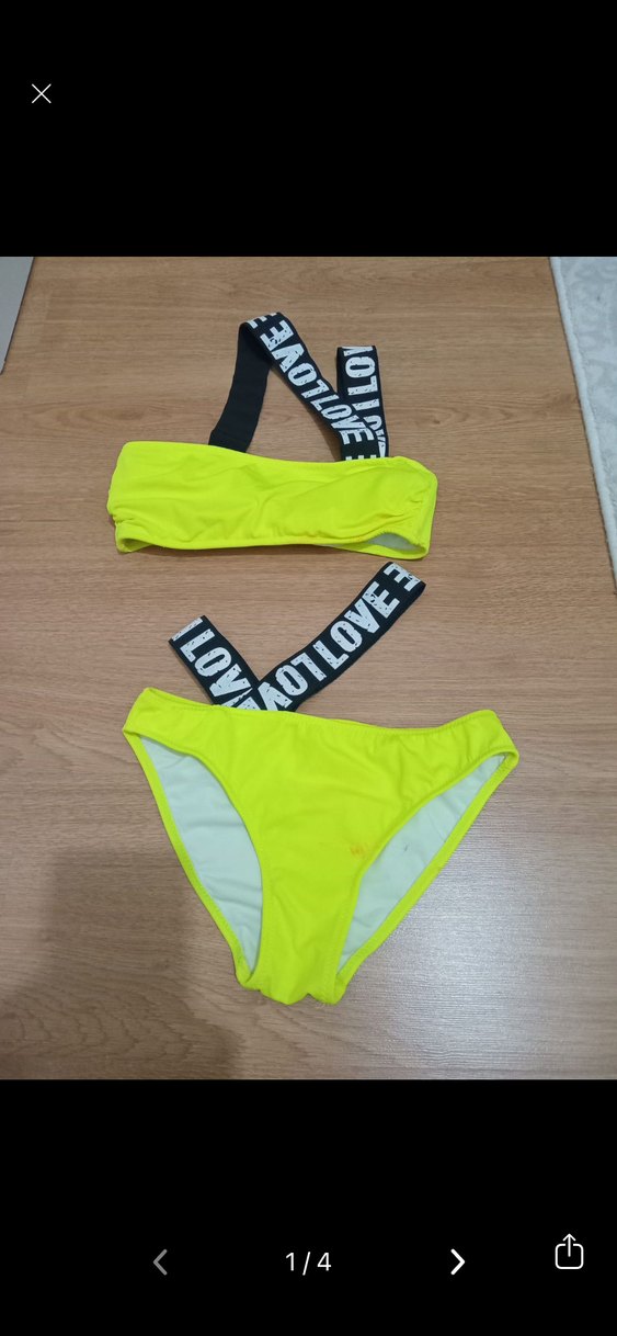 Askılı, sarı bikini takımı, siyah "LOVE" baskılı bantlar içerir. Plaj ve sokak giyimine uygundur. Leke mevcut
