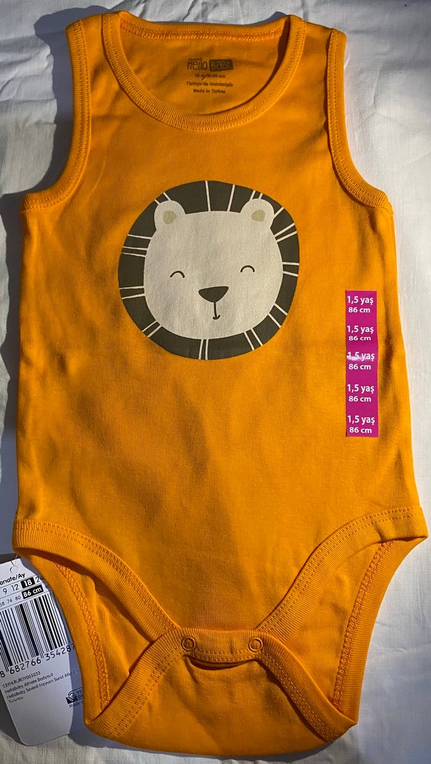 Sarı renkli, aslan baskılı, yuvarlak yakalı, erkek bebek atlet body. 1,5 yaş 86 cm için uygundur. Hiç kullanılmamıştır etiketi üstündedir ve değişim iade yoktur.