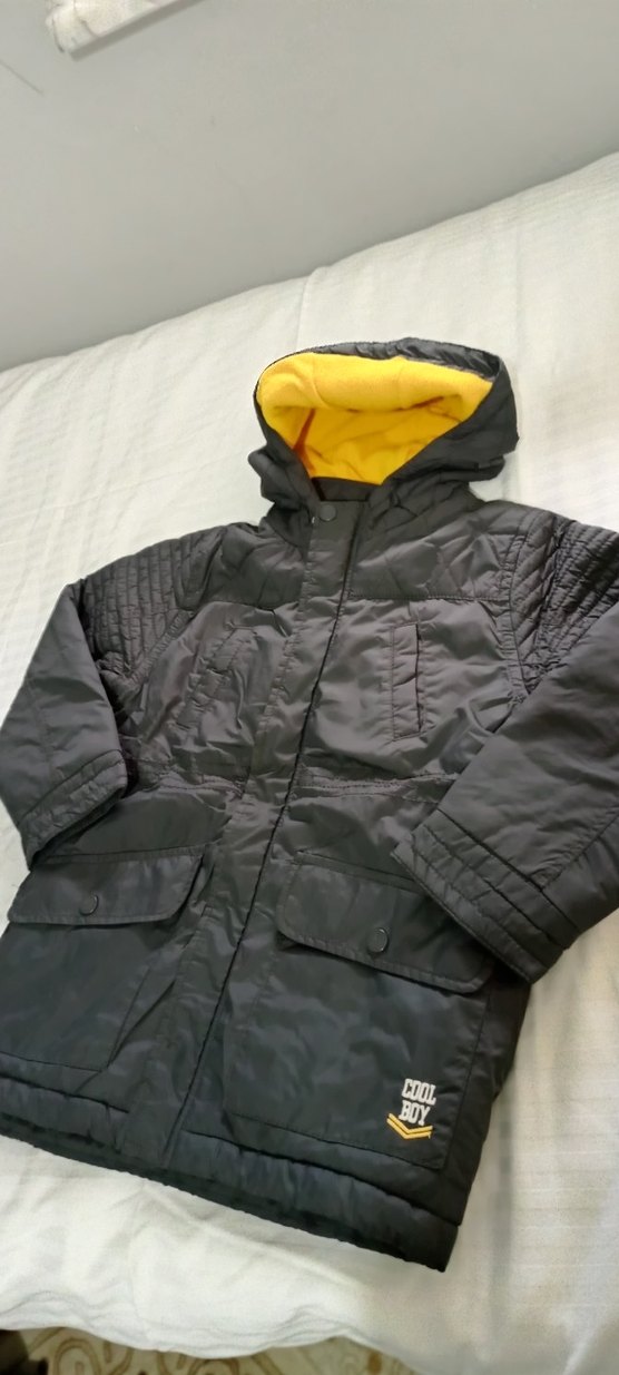 gri renkli sarı iç astarlı erkek çocuk montu. temiz sıkıntısı yok sayılı giyildi. ışıktan rengi net görünmüyor canlı füme renk