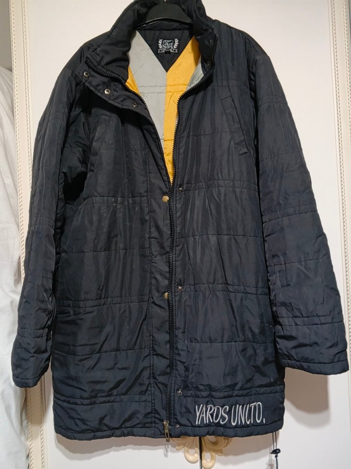 Sarı astarlı siyah midi erkek mont, geniş kesim, düğmeli ve uzun kollu. Notlu yaka ve sıcak tutan kumaştan, sokak stiline uygun. "YAROSUNTO." markalı. Almanyadan geldi