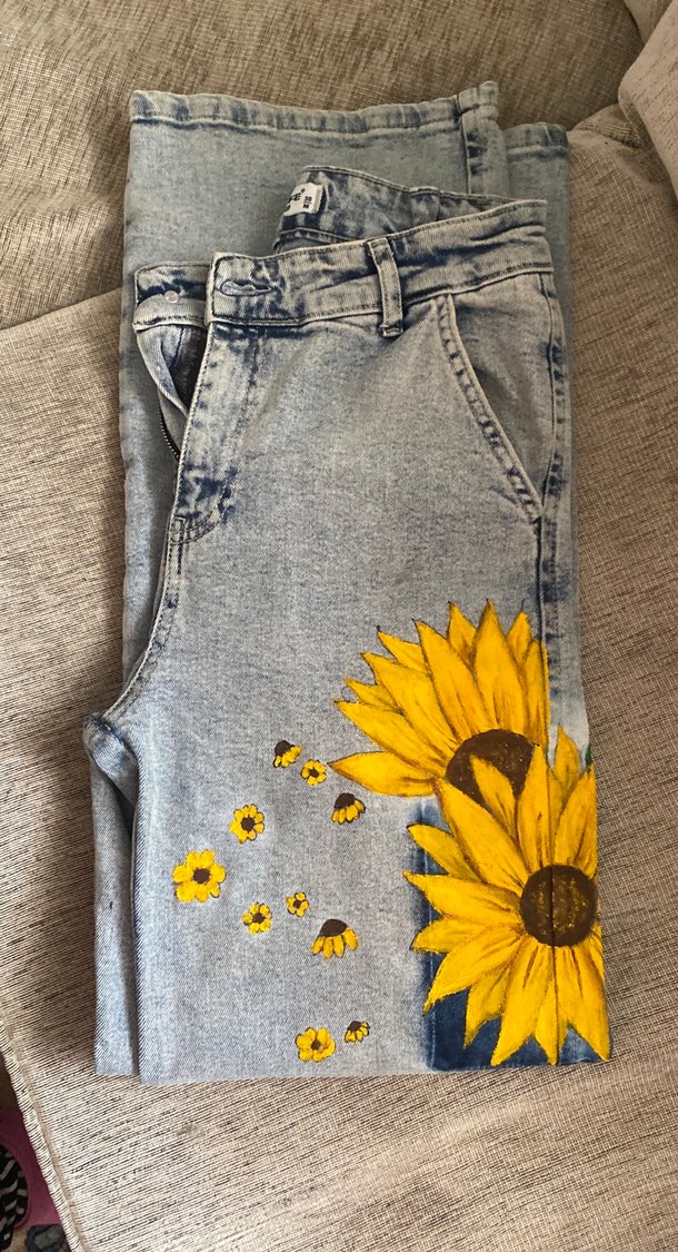 Sarı Ayçiçeği Desenli Gri Bol Kesim Kadın Kot Pantolon