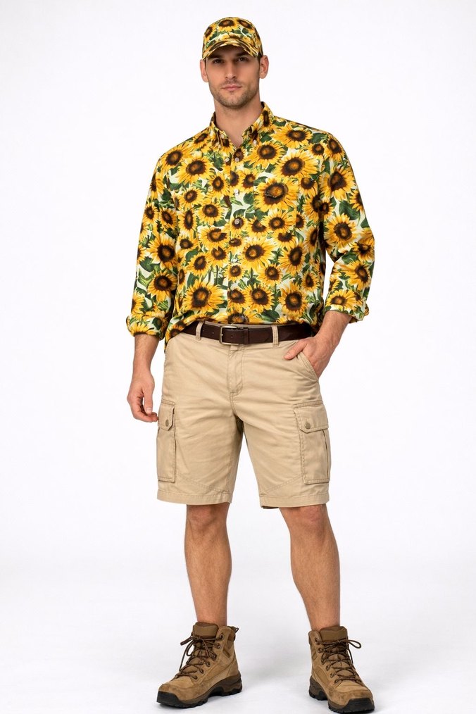 Erkek gömlek, rahat kesim, düğmeli , Sarı ayçiçeği desenli kamuflaj deseniyle, %100 pamuk gabardin kumaştan üretilmiştir. Casual sokak stili ve avcı kıyafeti için uygundur. Toptan satış için tüm bedenleri istenilen miktarda mevcuttur.