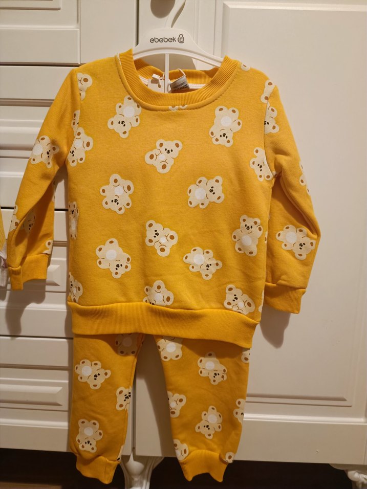 Renkli, uzun kollu, yuvarlak yaka, yumuşak ve sıcak kumaştan örme dokulu sarı ayıcık desenli bebek takımı.