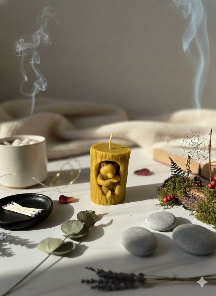 Sarı renkte, ayıcık figürlü mum, gri zemin üzerinde doğal dekoratif objelerle birlikte yer alıyor. ️ Doğal balmumundan yapılmıştır. Kraliçenin_arıları ig Beemine