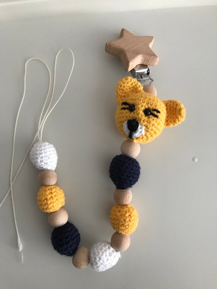 Sarı ayıcık başı, ahşap boncuklar ve yıldız şeklinde klips içeren renkli emzik askısı.