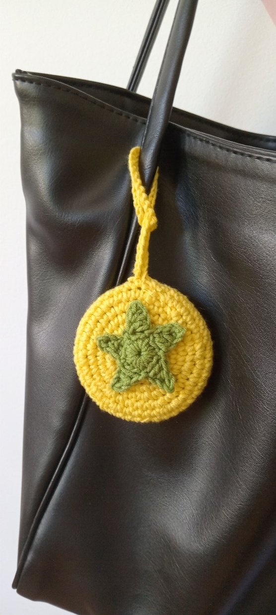 Örgü sarı yuvarlak taban üzerine yeşil yıldız işlenmiş . Çantalara veya anahtarlara renkli ve rahat bir dokunuş katıyor.