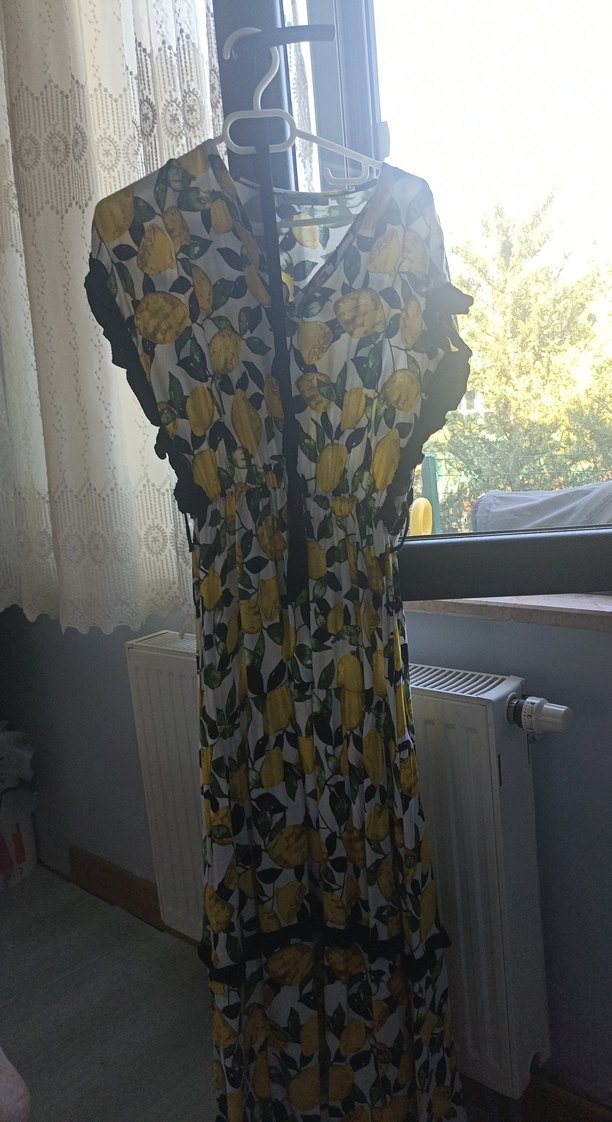 Sarı bağcıklı uzun elbise, V yaka ve kolsuz tasarıma sahip. Sentetik kumaştan, bol kesim ve bohem tarzda drapeli.