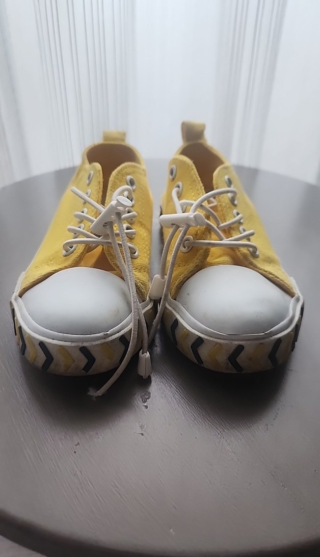 Sarı bağcıklı, renkli taban desenine sahip, kauçuk malzemeden cocuk spor ayakkabısı. Spor ve günlük kullanıma uygundur. ipliklerin ucundaki plastigin biri yok.