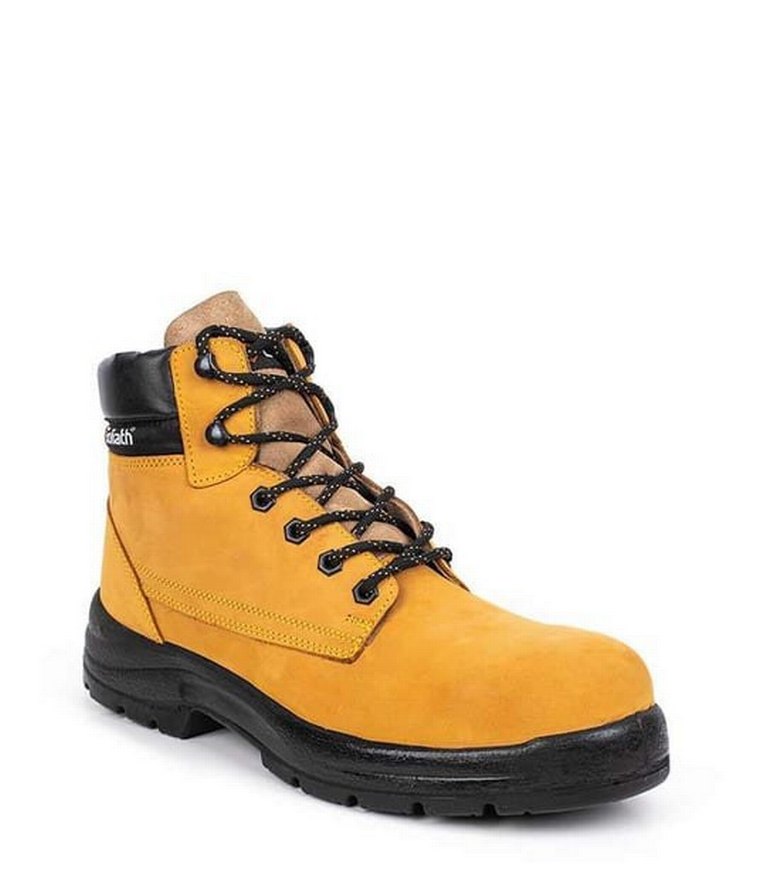 Parlak sarı kauçuk dış yüzeye, siyah bağcıklara ve sağlam tabana sahip erkek botu, günlük rahat kullanım için uygundur.
