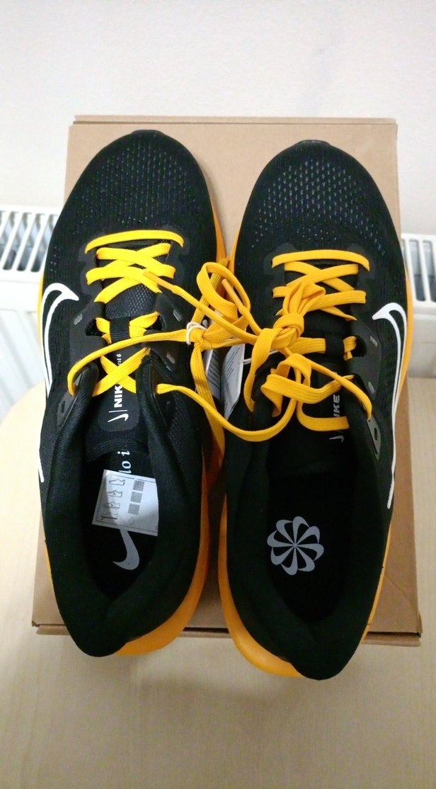 Siyah üst kısmı ve sarı bağcıklarıyla, koyu sarı kauçuk tabanlı erkek koşu ayakkabısı, spor ve günlük sokak stili için uygundur.