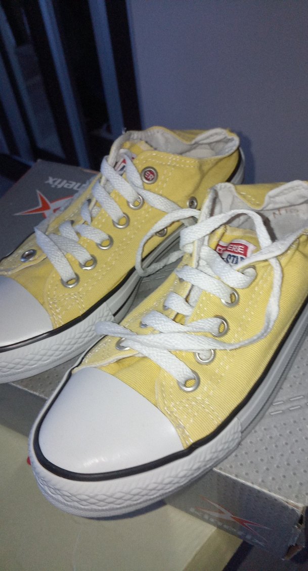 Sarı, beyaz bağcıklı, düz tabanlı kadın spor ayakkabısı. Rahat ve renkli, günlük sokak stili için uygun. orijinal