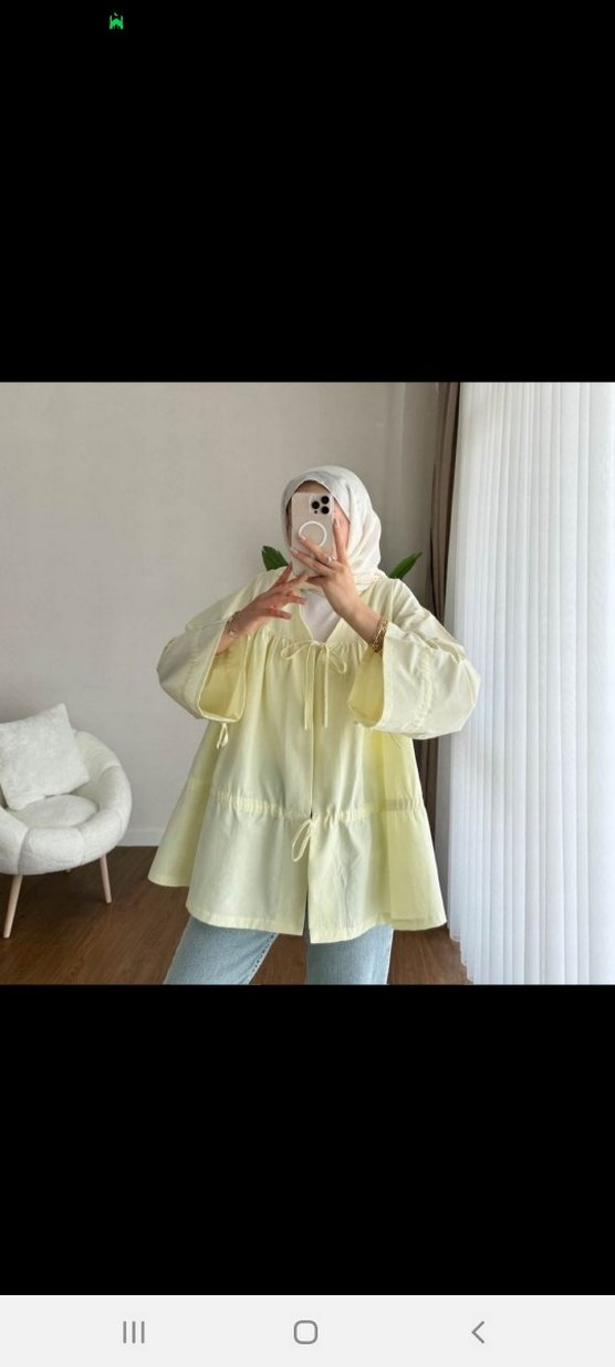 Pamuklu, uzun kollu, yüksek yakalı, pastel sarı bağcıklı bol kesim kadın tunik. Günlük kullanıma uygun, rahat ve şık bir parça.