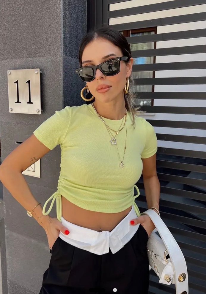 Sarı renkli, kısa kollu ve yuvarlak yakalı, bağcıklı mini crop top. Yumuşak sentetik kumaştan, günlük sokak modasına uygun şık bir parça.