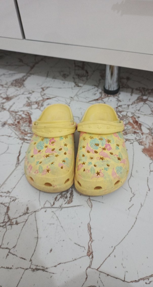 Sarı, pastel tonlarda tie-dye desenli, bağcıklı kayışlı kız çocuk terlikleri. Rahat kauçuk malzemeden üretilmiştir. Bohem tarz için uygun.