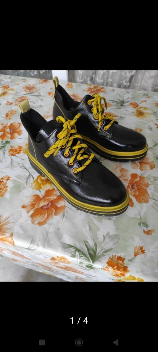 Siyah ayakkabılar, canlı sarı bağcıklar ve taban detayları ile sokak stilini yansıtıyor. Parlak yüzeye sahip, rahat bir tasarım.
