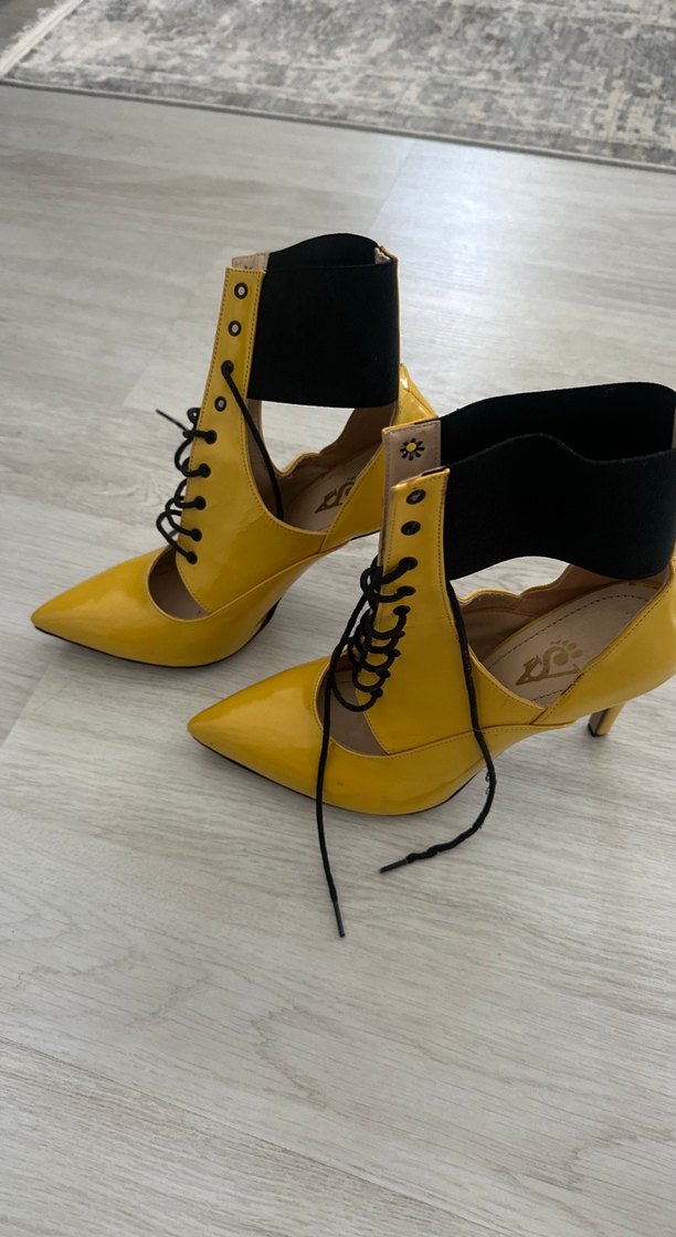 Sarı bağcıklı stiletto topuklu botlar, kauçuk malzeme ve baskılı desenle gündelik kullanım için çağdaş ve avangart tarzı bir araya getiriyor.